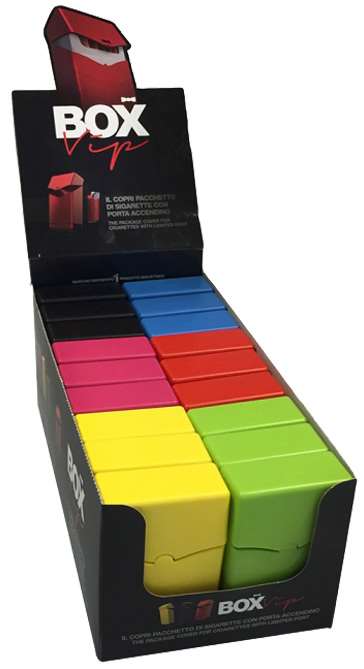 Zigarettenbox PVC 20er mit Feuerzeug Dock(für Bic Mini Fzg.abnehmbar)6-farben sort. im 18er Dsp.(94547)