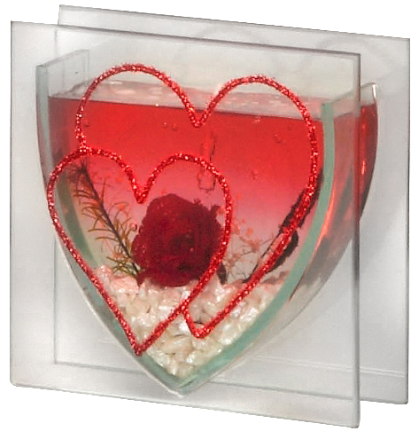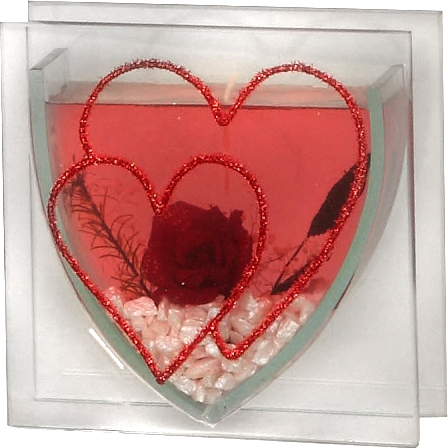 Glasdeko mit einem glitzernden Doppelherz und Rose in roter Jelly-Kerze h=12cm b=12cm