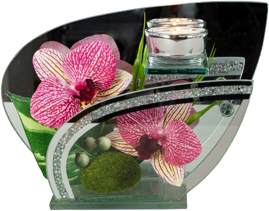 Glasdeko Teelichthalter im geschwungenen Design mit dunkelrosa Orchidee-Blüten ca. h=16+cm b=22cm