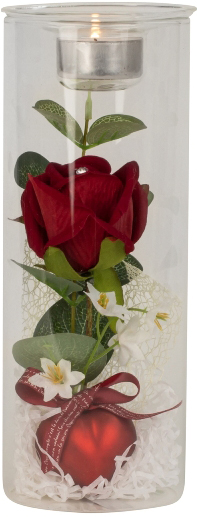Glasdeko zylindrisch geformt für ein Teelicht geschmückt mit roten Rosen und Dek