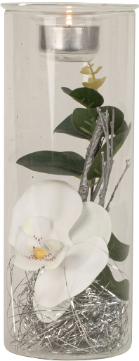 Glasdeko zylindrisch geformt für ein Teelicht geschmückt mit weißen Orchideen un