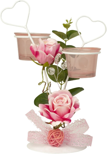 Metalldeko Gesteck für zwei Teelichter geschmückt mit rosa Rosen, zwei Herzen und einem Schleifchen ca. h=24cm b=17cm