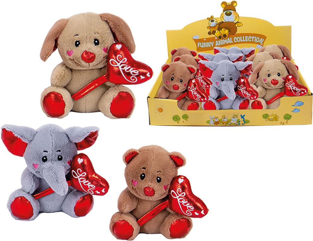 Plüsch Tierchen mit Herzballon in der Hand Love ca. 14cm 3/s (Hund, Elefant, Bärchen) im 12er T-Dsp.