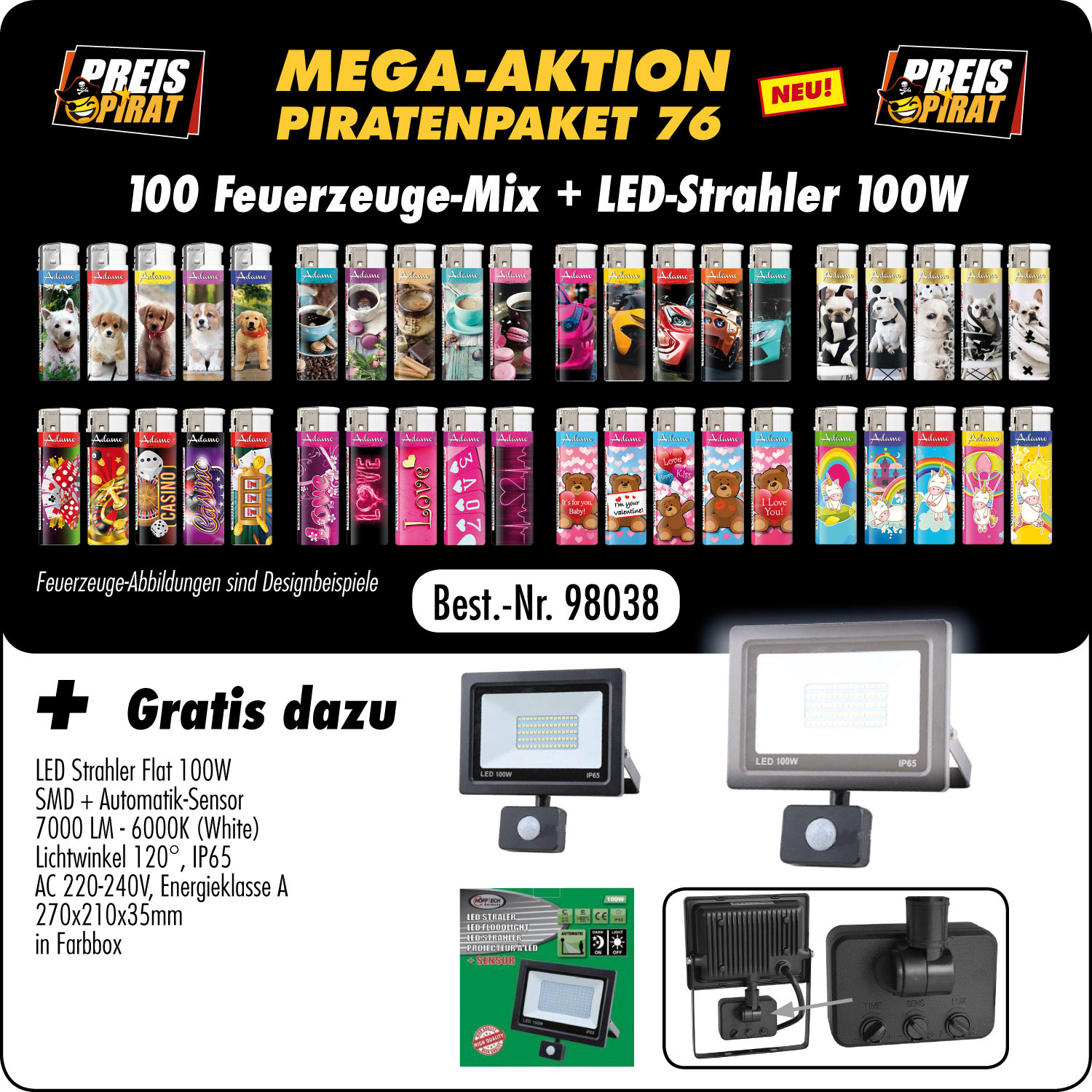 Piraten Aktions Paket S 76- mit 100 Motiv Fzg. Mix + Gratis LED Straler Flat 100W SMD + Automatik Sensor 7000 LM - 6000K(White) Lichtwinkel 120° IP65 AC 220-240V Energieklasse A 270x210x35mm in Farbbox