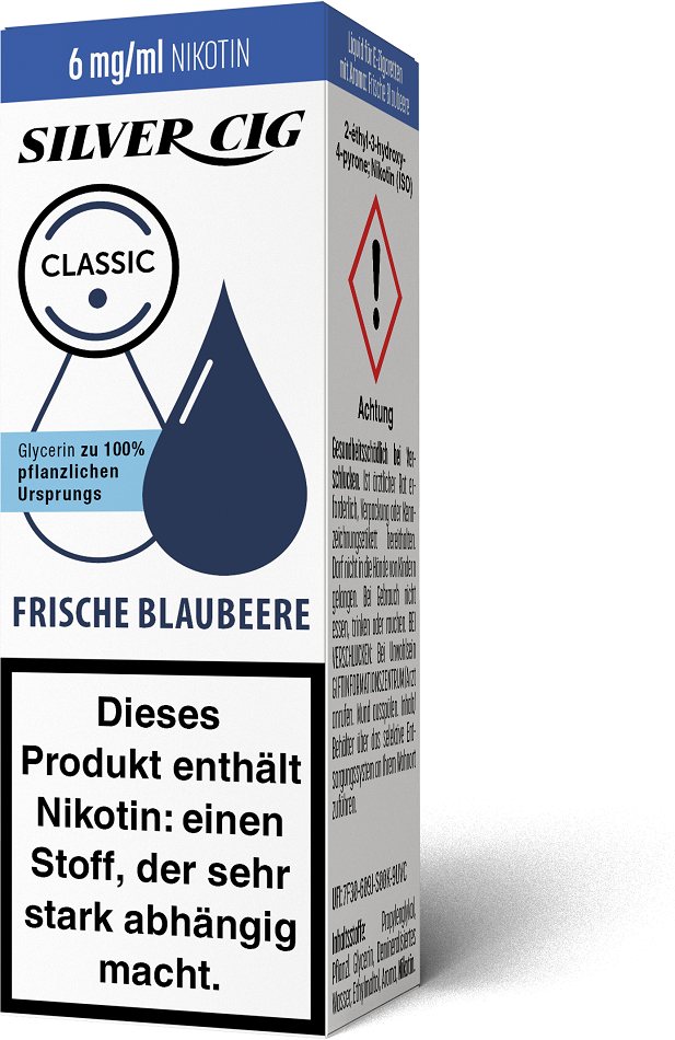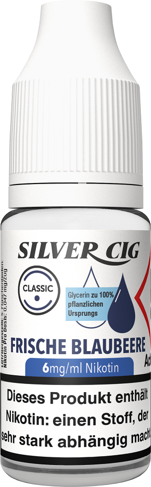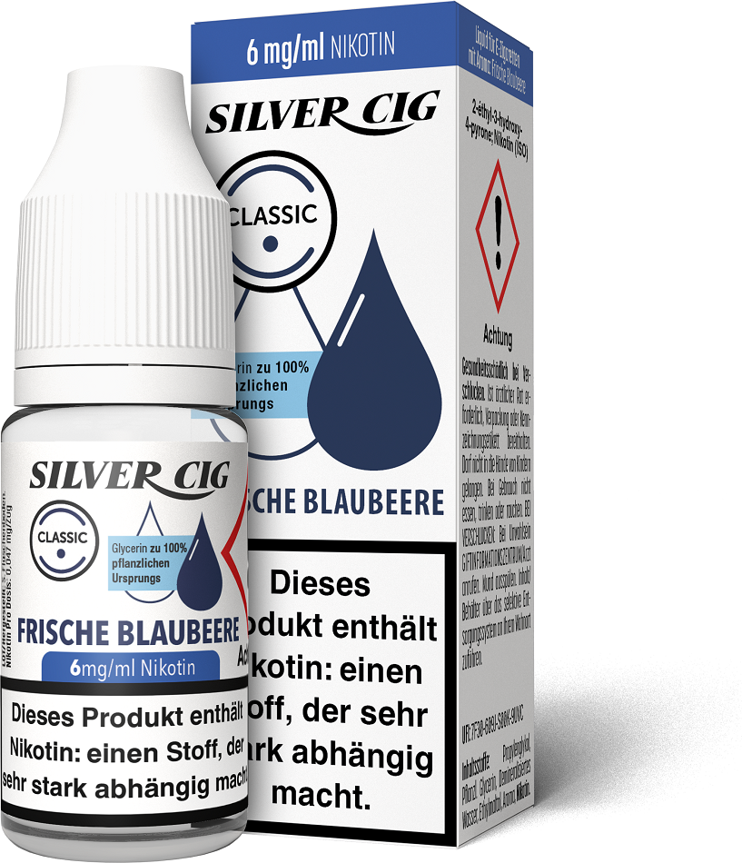 E-Liquid Silver-Cig FRISCHE BLAUBEERE 6mg/ml Nikotin 10ml im 5er Dsp.(DPT2 Konform EU Herstellung PG-VG Anteil 70/30%)(mit Steuerbanderole)