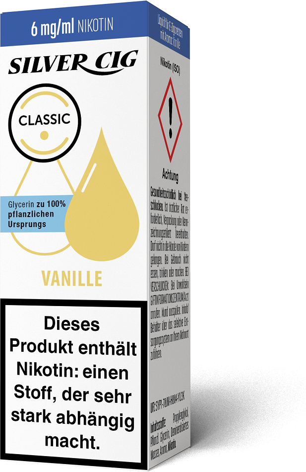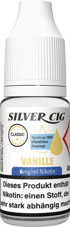 E-Liquid Silver-Cig VANILLE 6mg/ml Nikotin 10ml im 5er Dsp.(DPT2 Konform EU Herstellung PG-VG Anteil 70/30%)(mit Steuerbanderole)