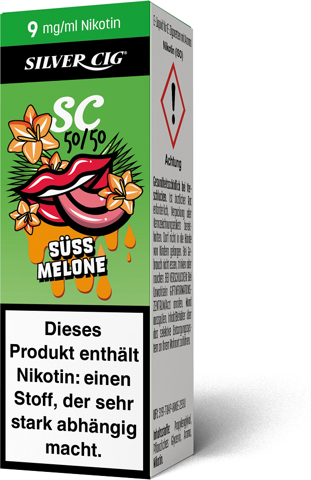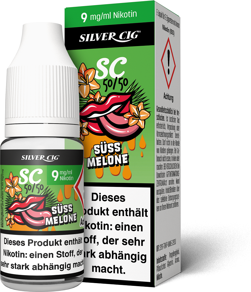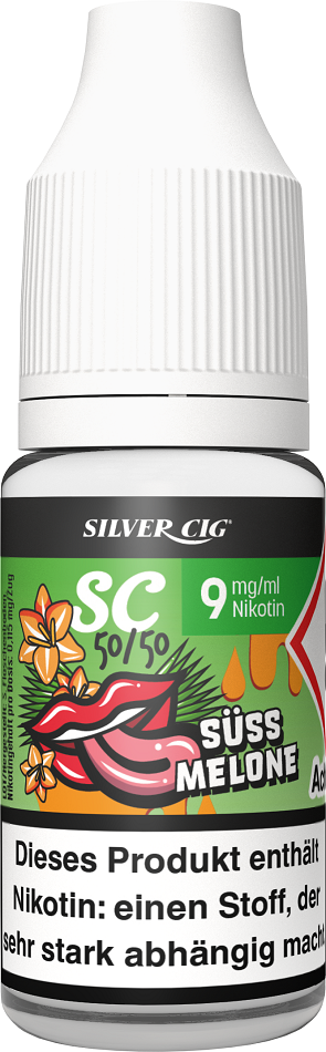 E-Liquid Silver-Cig SÜSS MELONE 9mg/ml Nikotin 10ml im 5er Dsp.(DPT2 Konform EU Herstellung PG-VG Anteil 50/50%)(mit Steuerbanderole)