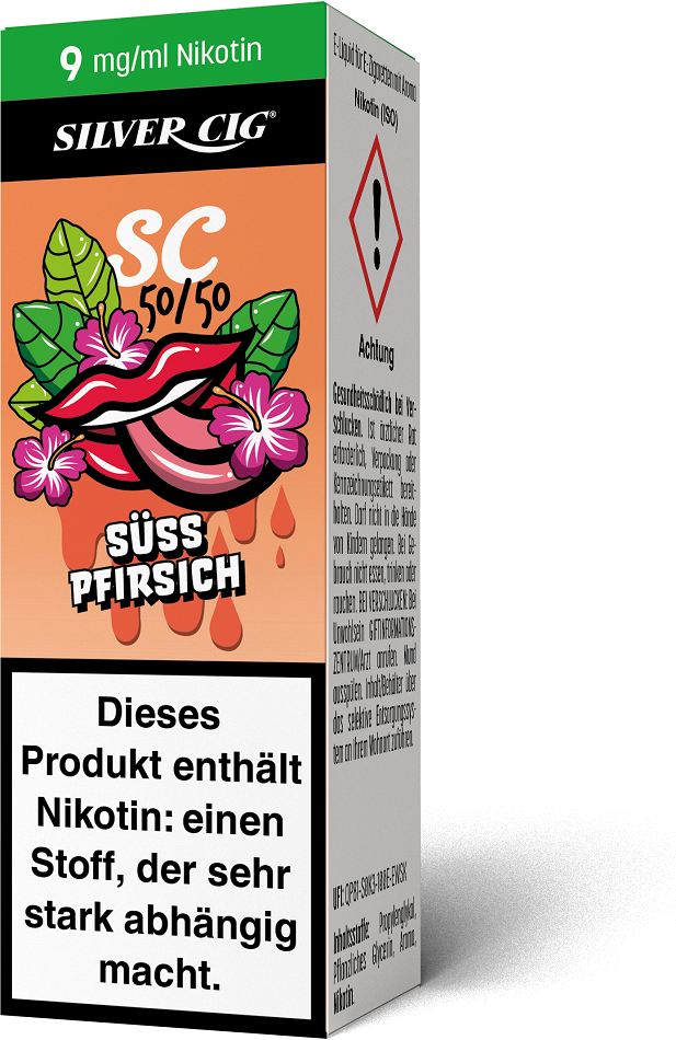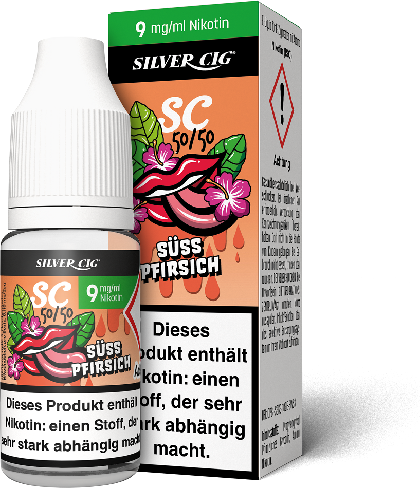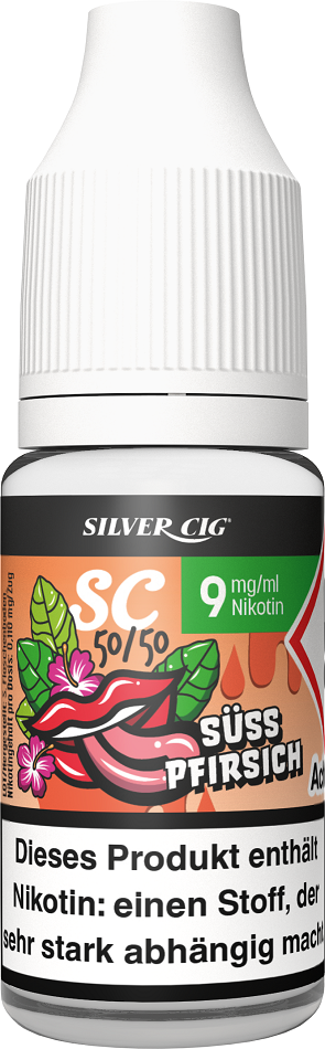 E-Liquid Silver-Cig SÜSS PFIRSICH 9mg/ml Nikotin 10ml im 5er Dsp.(DPT2 Konform EU Herstellung PG-VG Anteil 50/50%)(mit Steuerbanderole)