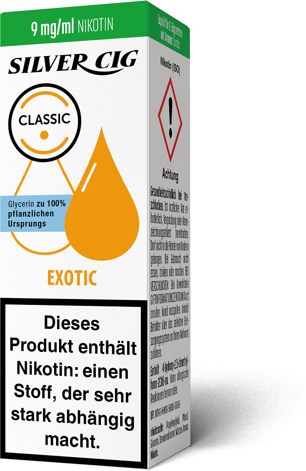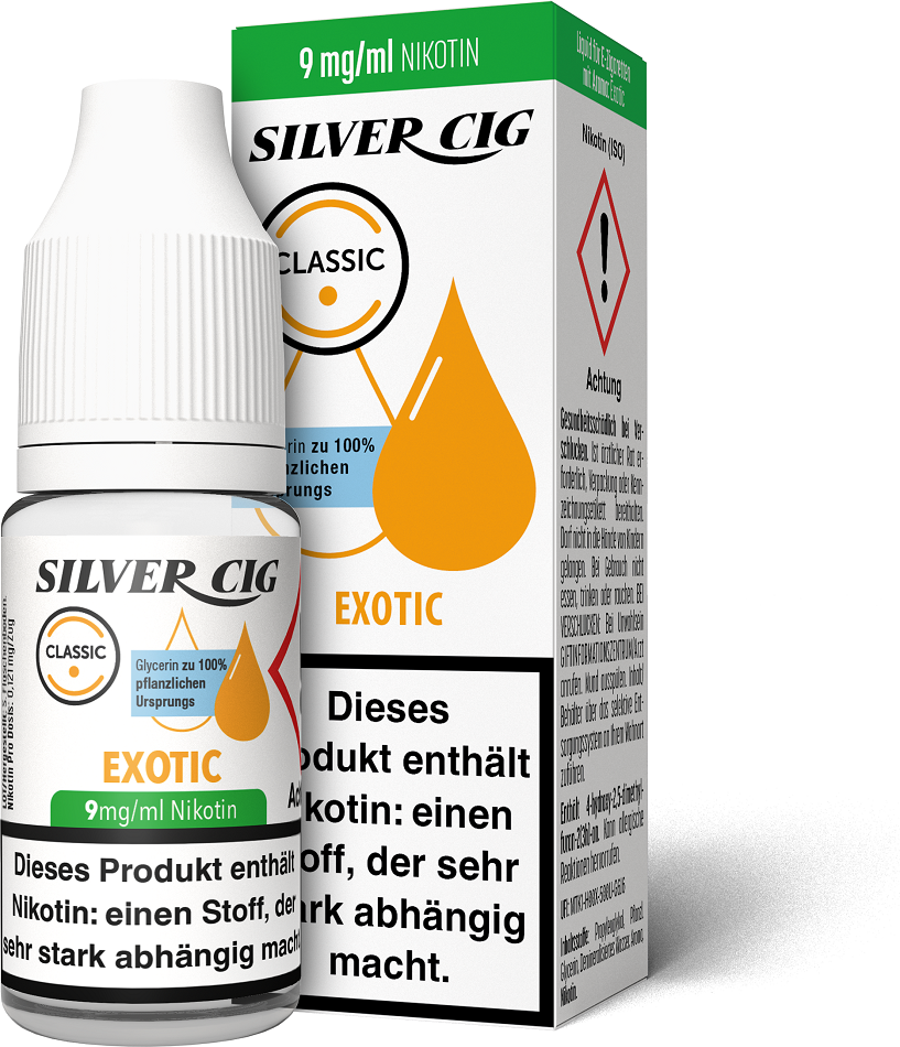 E-Liquid Silver-Cig EXOTIC 9mg/ml Nikotin 10ml im 5er Dsp.(DPT2 Konform EU Herstellung PG-VG Anteil 70/30%)(mit Steuerbanderole)