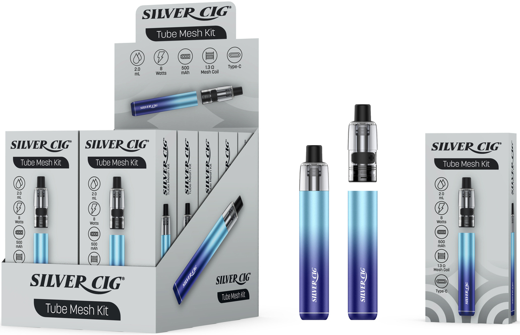E-Zigarette Tube Mesh Kit BLUE Silver Cig 500mAh 8W 2ml Liquid Fassungsvermögen 1,3O Mesh Coil, aufladbar über USB-C