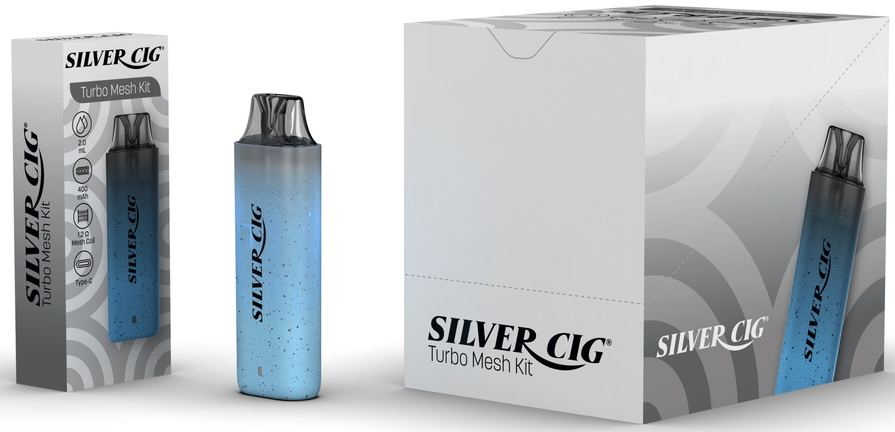 E-Zigarette Turbo Mesh Kit BLUE Silver Cig 400mAh 13W 2ml Liquid Fassungsvermögen 1,2O Mesh Coil, aufladbar über USB-C