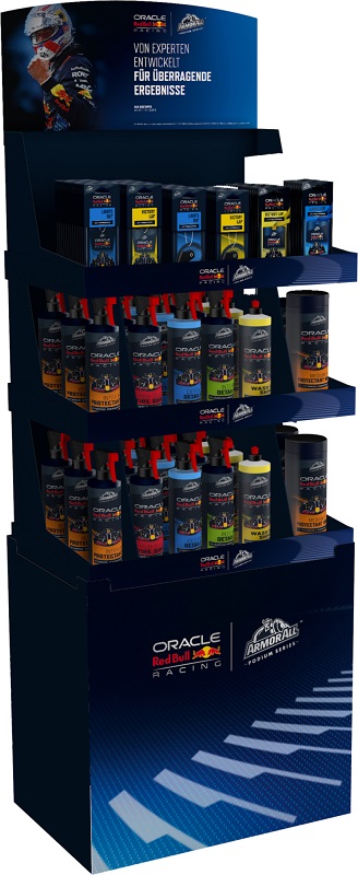 Armor All - Oracle Red Bull Racing Podium Series Verkaufsaufsteller 132tlg. - Bodendisplay bestückt mit: 8x Interior Detailer&Protectant 500ml, 8x Hybrid + Ceramic Wipes Medium Shine Clean & Protect, 8x Hybrid + Ceramic Interior Protectant 500ml, 8x Hybrid + Ceramic Exterior Detailer 500ml, 8x Hybrid + Ceramic Wash & Shine 500ml, 8x Hybrid + Ceramic Tire Shine 500ml, 14x Access Pass Lufterfrischer Victory Lap, 14x Access Pass Lufterfrischer Lights Out, 14x Lufterfrischer Victory Lap, 14x Lufterfrischer Lights Out, 14x Helm 2D Lufterfrischer Victory Lap, 14x Helm 2D Lufterfrischer Lights Out