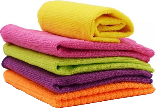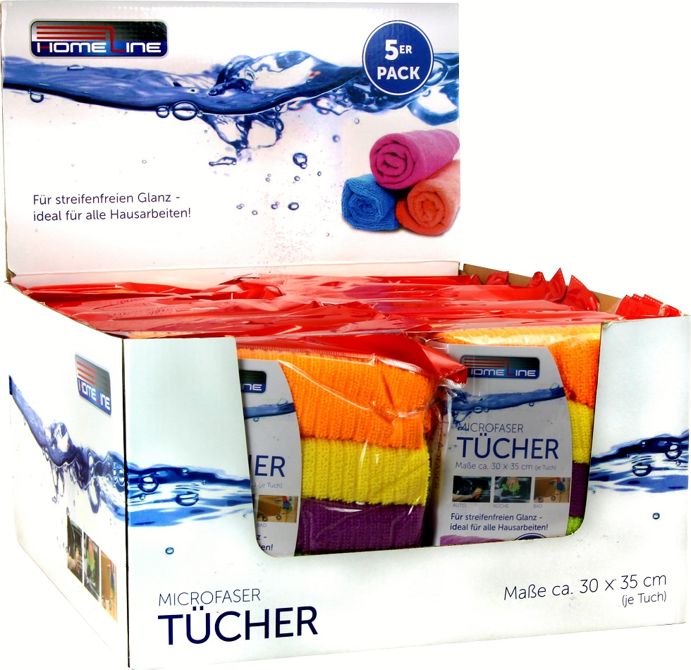 Mikrofasertücher 5er Pack farbig sort. in Polybag mit Sichtfenster ca. 30x35cm in 24er T-Dsp. (Orange, Pink, Lila, Gelb, Hellgrün)