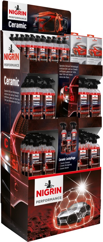 Nigrin CERAMIC Verkaufsaufsteller 60tlg. - Bodendisplay bestückt mit: 18x Performance Ceramic-Shampoo 500ml, 18x Performance Ceramic-Versiegelung 750ml, 18x Performance Ceramic-Detailer 750ml, 6x Performance XXL Trockentuch