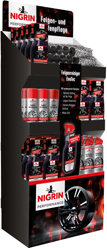 Nigrin Felgen & Reifen Verkaufsaufsteller 89tlg. - Bodendisplay bestückt mit: 12x Mikrofaser-Felgenbürste, 35x Felgen-Reiniger EvoTec 750ml, 24x Felgen-Versiegelung Aerosol 300ml, 18x Reifen-Glanz & Pflege 500ml