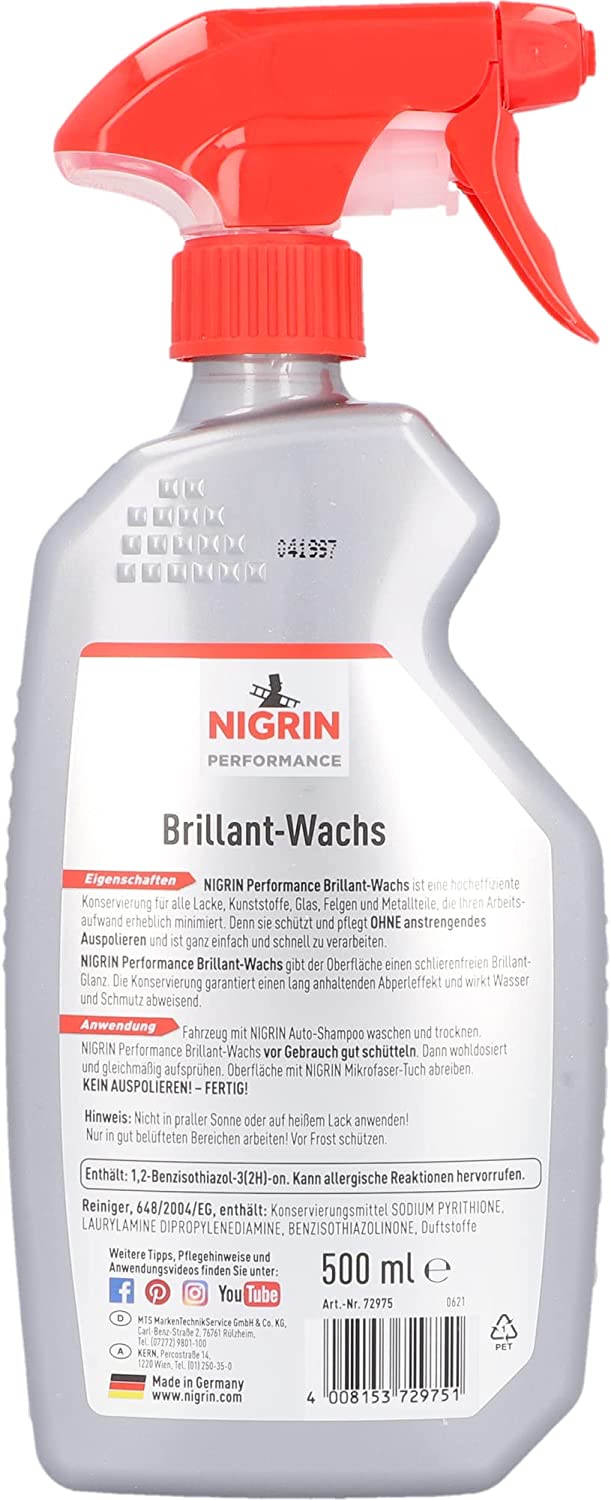 Nigrin Performance Brillant-Wachs Detailer für alle glatten Oberflächen in 500ml Sprühflasche