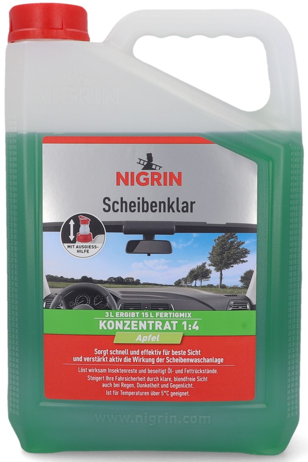 'NIGRIN Scheibenklar ermöglicht eine sichere Fahrt durch beste Sicht. Es reinigt äußerst effektiv und beseitigt in kürzester Zeit alle Schmutzrückstände. Selbst Insektenreste, Öl- und Fettrückstände werden problemlos beseitigt. Trotz seiner Effektivität bietet es eine geprüfte Materialverträglichkeit: Es schont Lack- und Kunststoffoberflächen, Gummi, Metall und Chrom, ist Polycarbonat-verträglich und verhindert so Spannungsrisse an Scheinwerfer-Streuscheiben. Es ist auch für Xenon-Scheinwerfer und Fächerdüsen geeignet. Egal, ob es sich um die Front- oder Heckscheibe oder um die Scheinwerfer handelt: Alle Oberflächen sind nach der Reinigung streifen- und schlierenfrei. Bei Kunden ist NIGRIN Scheibenklar Konzentrat besonders wegen seiner Ergiebigkeit sehr beliebt. 3 Liter des Konzentrats ergeben durch den Zusatz von 12 Litern Wasser einen einsatzbereiten Fertigmix von 15 Litern. Das NIGRIN Scheibenklar besitzt zudem eine integrierte Ausgießhilfe. Somit ist ein sauberes Einfüllen der Flüssigkeit gewährleistet und das Scheibenklar kann nach der Anwendung wieder auslaufsicher verschlossen werden. Das NIGRIN Scheibenklar Konzentrat duftet zudem angenehm nach Apfel. Unter 5 °C sollte es durch NIGRIN Scheiben-Frostschutz ersetzt werden!