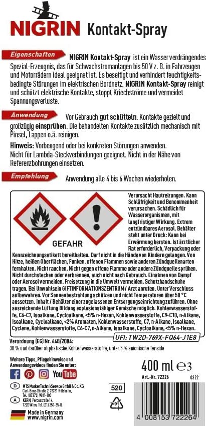 Nigrin Kontakt-Spray in 400ml Sprühdose (Reinigung und Schutz von elektronischen Kontakten)