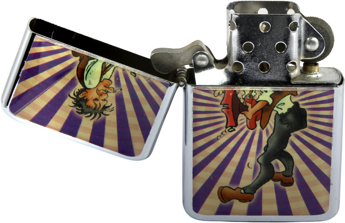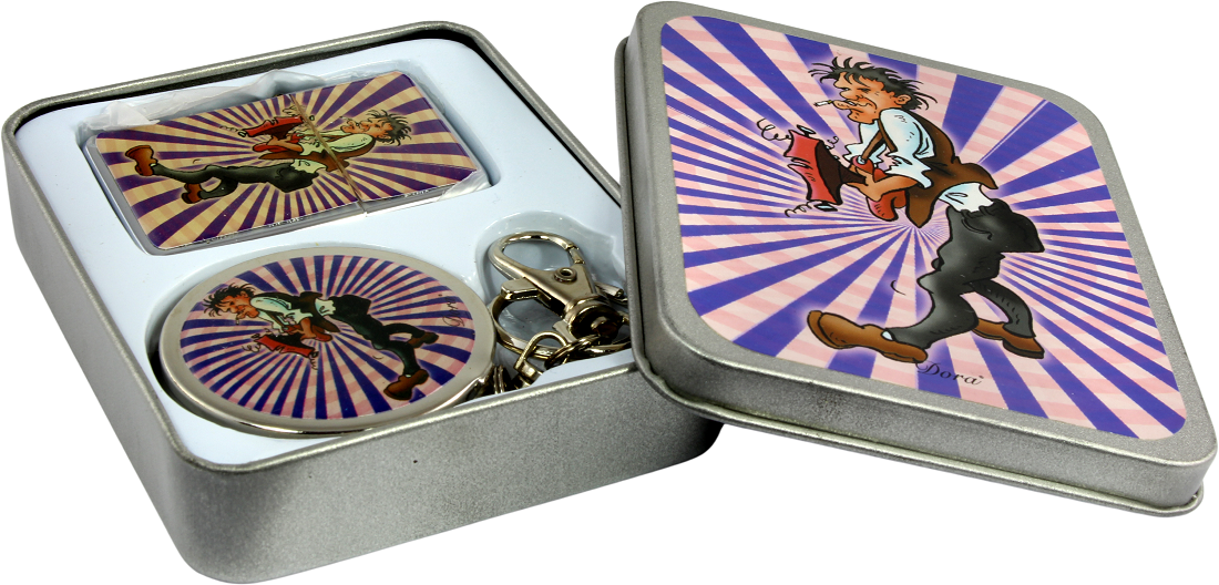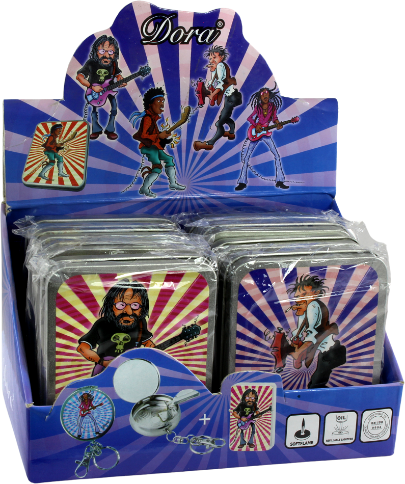 Dora Smoking Set in Metallbox 2tlg. Metall Benzin Fzg. mit Rockabilly Motiv und Metall Taschenascher 4/s im 8er T-Dsp.