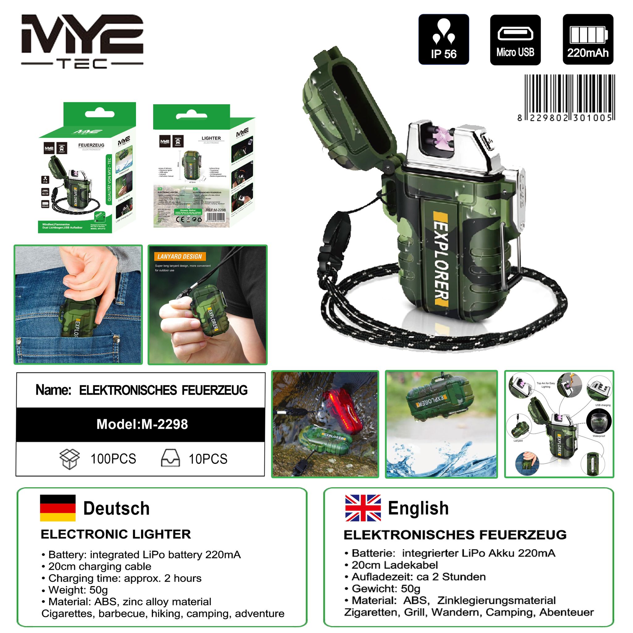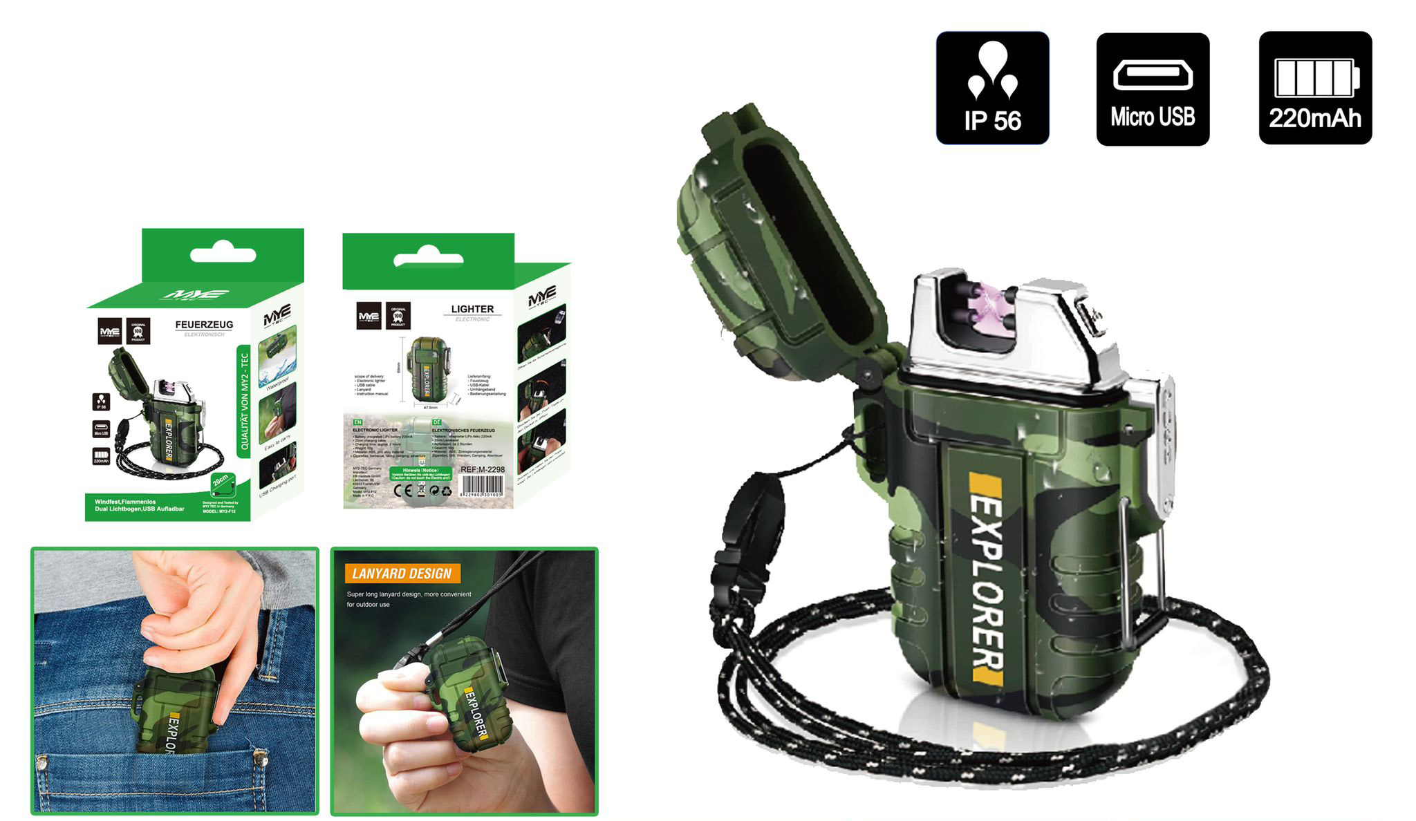 Outdoor Dual Lichtbogen Fzg. mit Klappe&Umhängeband Aufladbar 220mAh Micro USB i