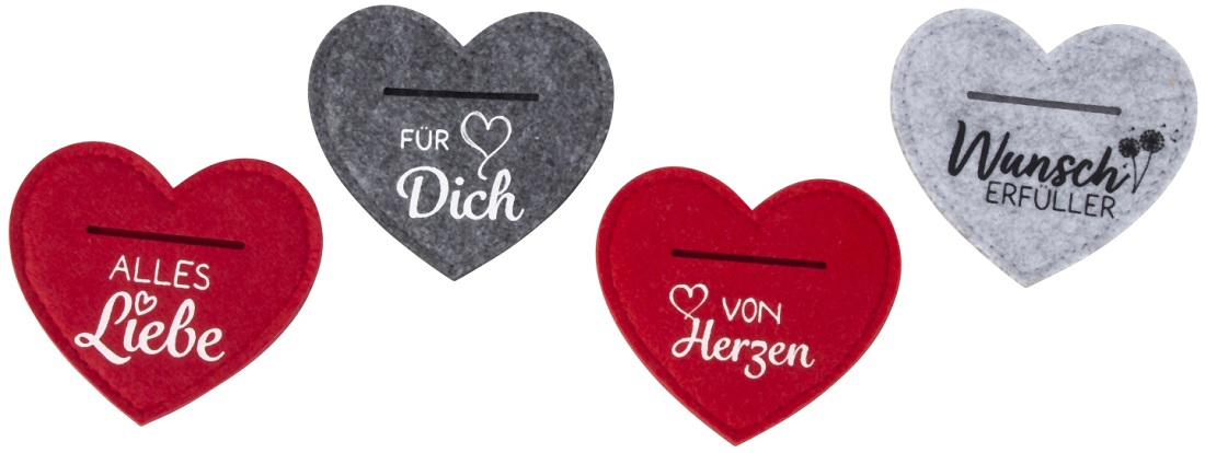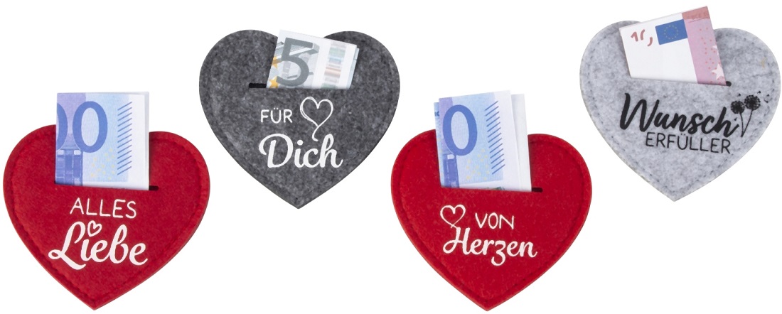 Filz-Geldgeschenk Herz mit aufgedrucktem Spruch 4/s ca.9 x 10cm (Alles Liebe, Für Dich, von Herzen, Wunsch Erfüller)