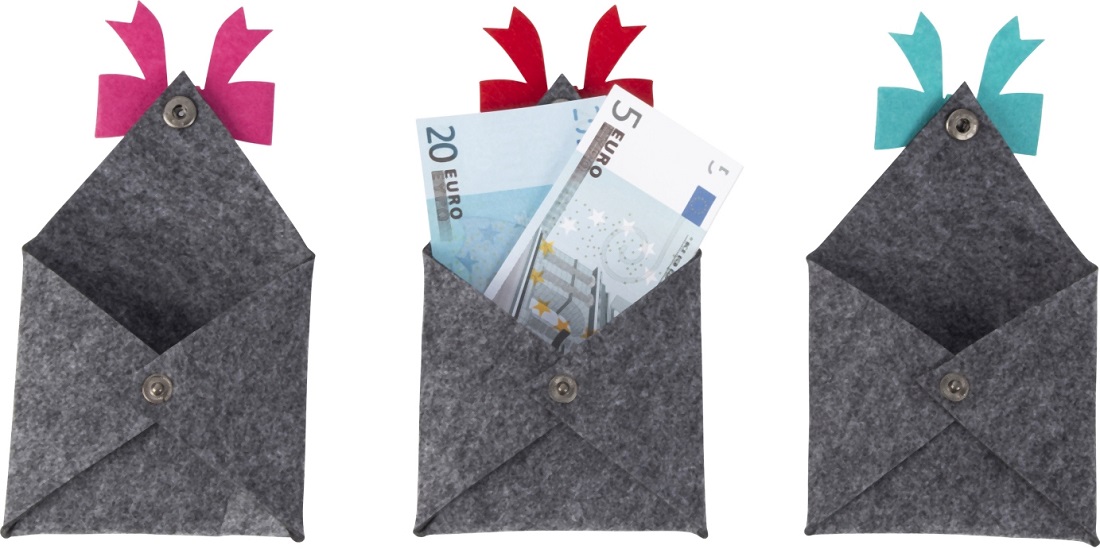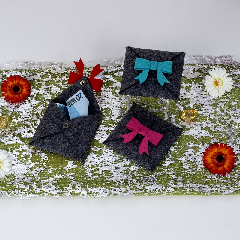 Filz-Geldgeschenk Umschlag grau mit bunter Schleife ca. 10 x 10cm 3/s (Pink, Rot, Blau)