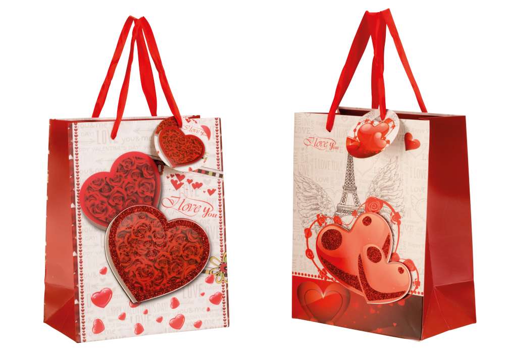 Geschenktüte Herzen m.Glitzer+ Aplikation 2/s 18x23x10cm