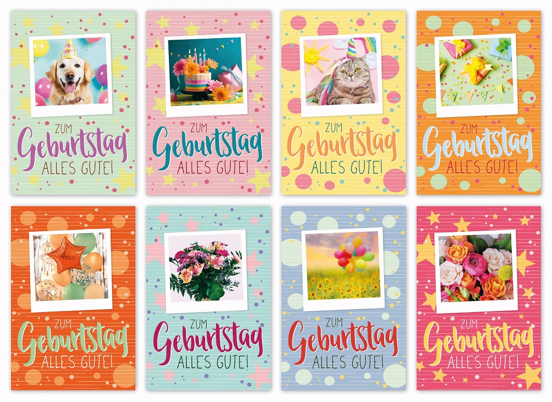 Geburtstagskarten ca. 10 x 17cm 8/s mit knalligen & bunten Motiven, im Polybeutel