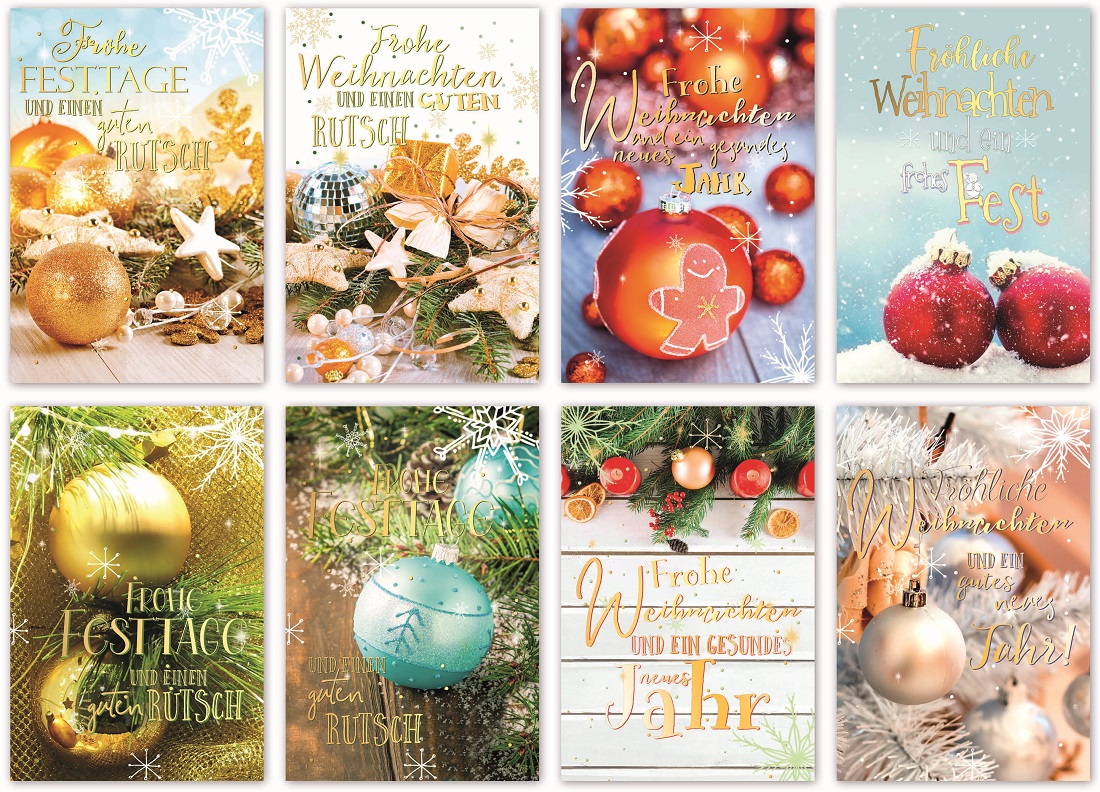 Weihnachts-Grußkarten ca. 11,5 x 17cm 8/s mit farbenfrohen Motiven für Weihnachten & Neujahr, im Polybeutel