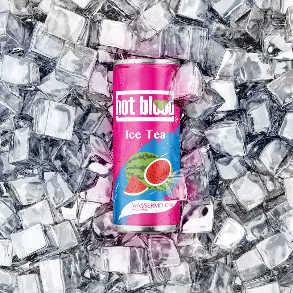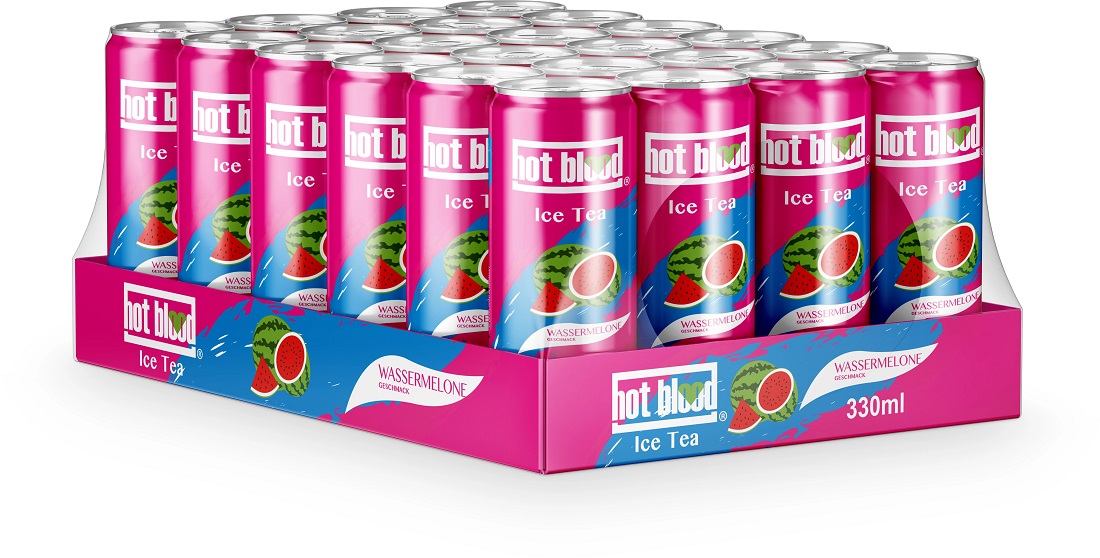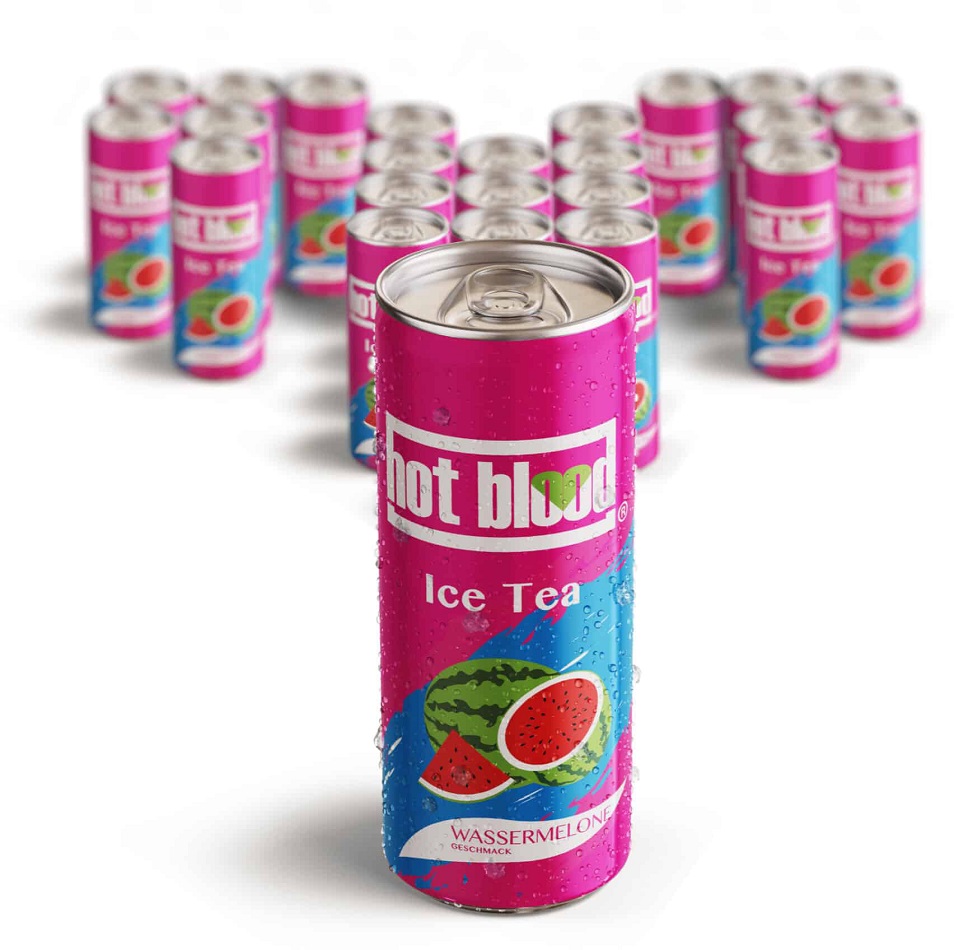Hot Blood Ice Tea Wassermelone Geschmack Vegan 330ml (DPG Einwegpfand/Pfanddose) im 24er Tray