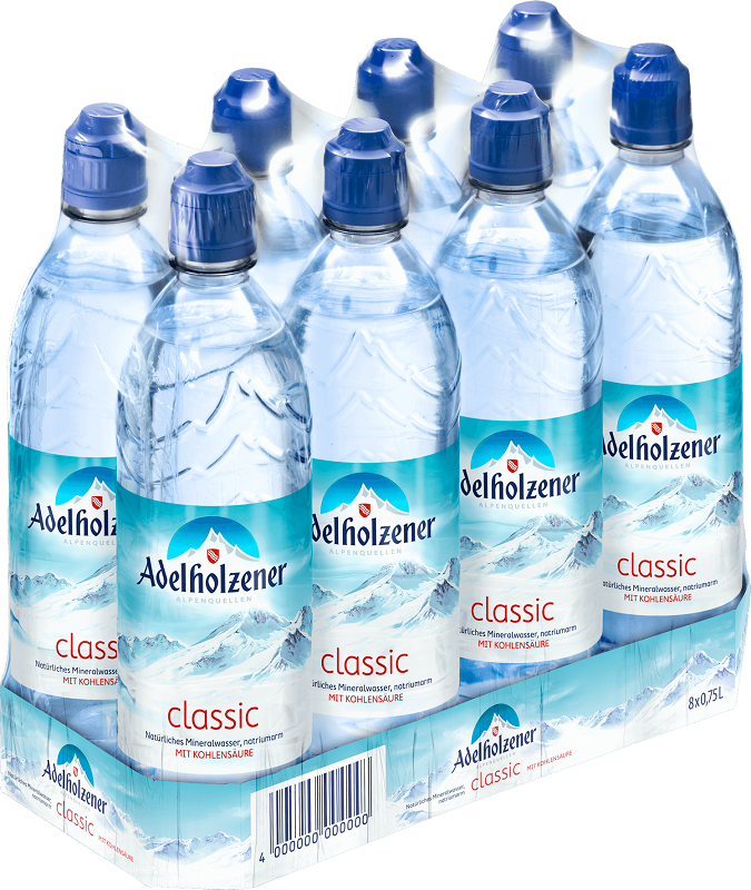 Adelholzener Classic mit Sportscap natürliches Mineralwasser mit Kohlensäure 750ml (DPG Einwegpfand/Pfanddose) im 8er Tray