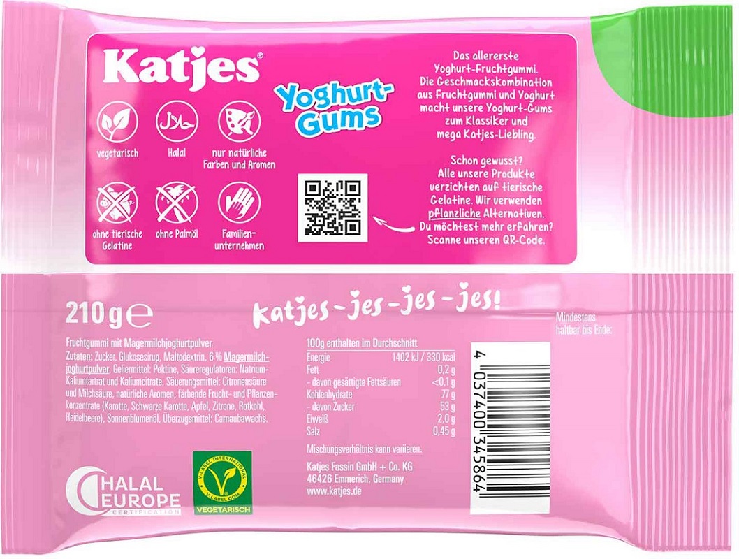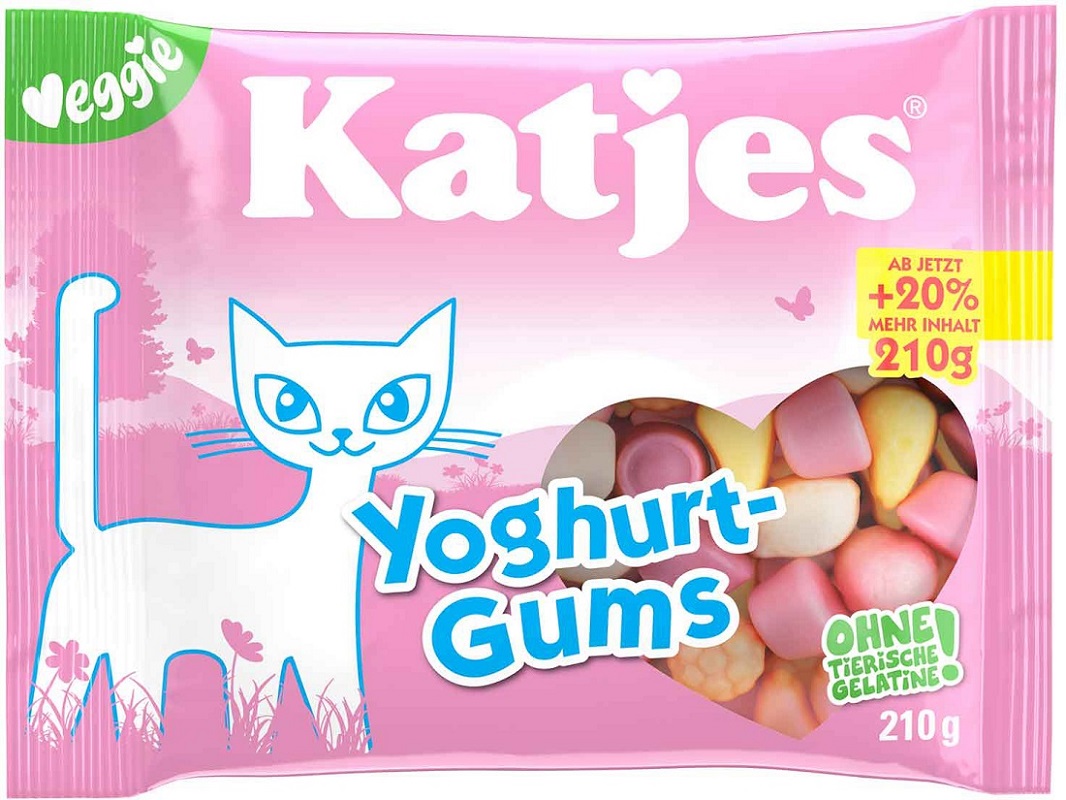 Katjes Yoghurt-Gums, softe Joghurt Fruchtgummis, mit natürlichen Aromen und Farben. Für Vegetarier geeignet im 210g Beutel