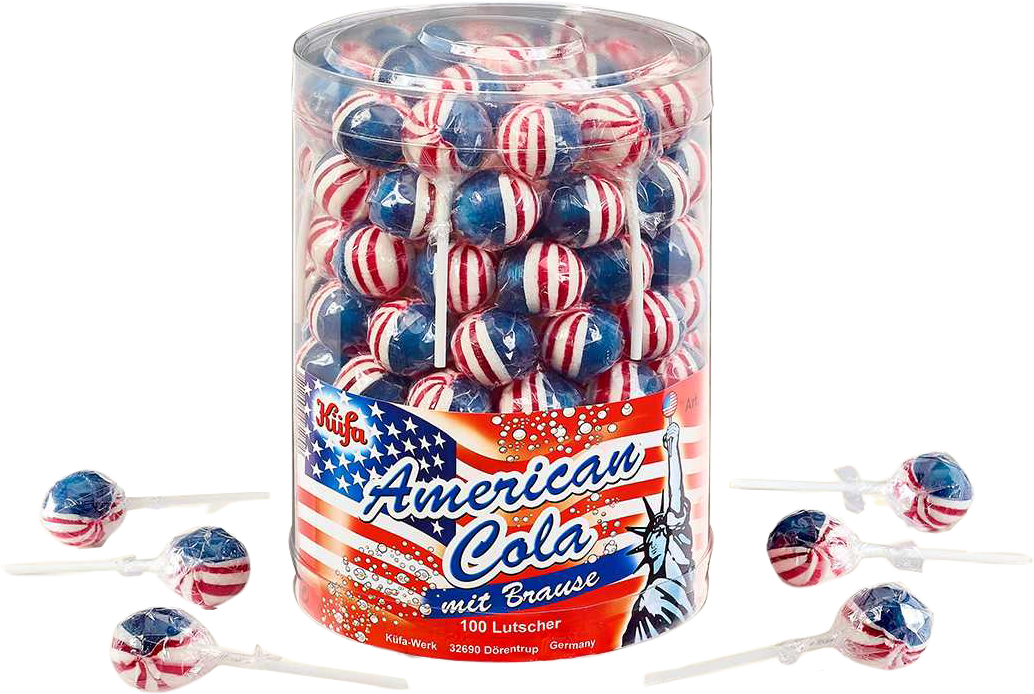 Küfa American Cola Lollis mit Himbeere-Cola-Geschmack und einem Kern aus Brausepulver in 100er Dose
