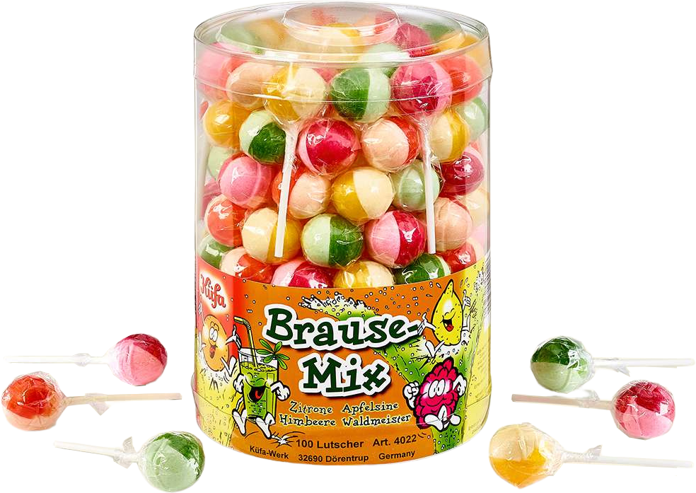 Küfa Brause Mix Lollis in versch. Geschmäcker mit Brause 4/s (Zitrone, Apfelsine, Himbeere, Waldmeister) in 100er Dose