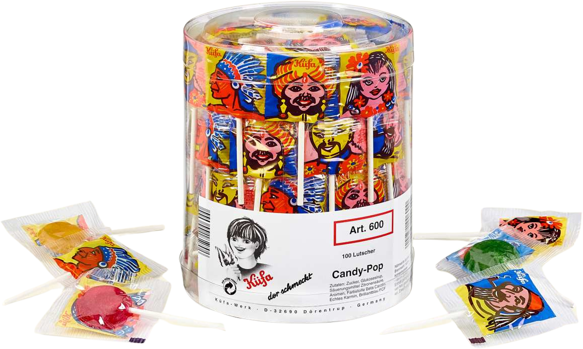 Küfa Candy Pop Frucht Lollis mit Menschen aus den 50er Jahren, 3 versch. Geschmäcker (Zitrone, Kirsche, Apfel) in 100er Dose