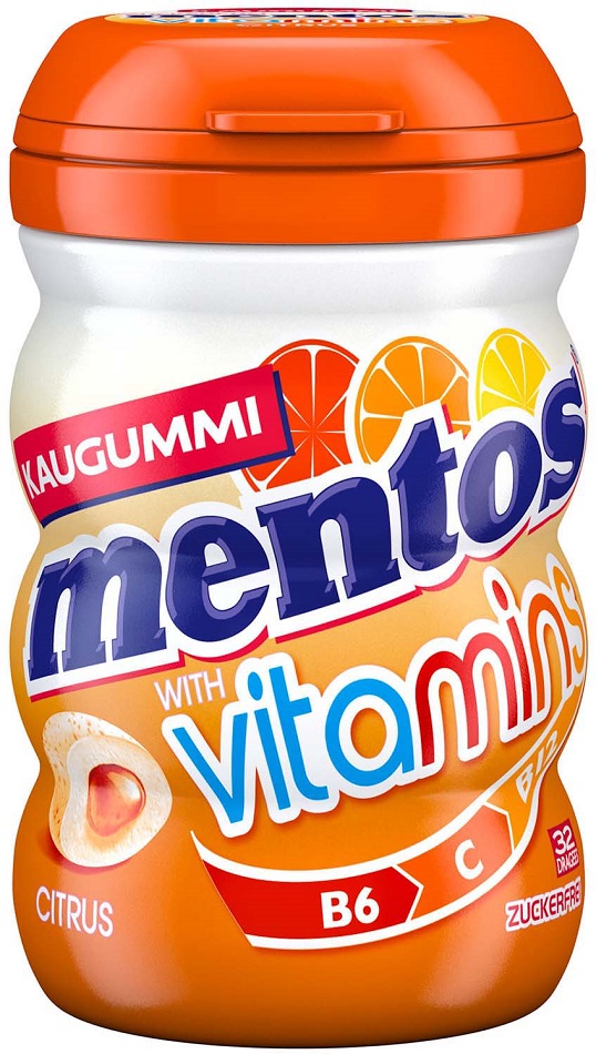 Mentos Gum Vitamins Citrus zuckerfreie Kaugummi-Dragees mit Früchtegeschmack, flüssigem Kern und Vitamin B6/C/B12 35-Dragees á 64g in 6er T-Dsp.