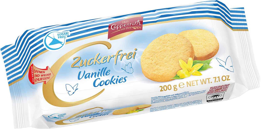 Coppenrath Vanille Cookies Zuckerfrei, zartes Vanille Mürbgebäck ohne Zucker im 200g Frischepack (wiederverschließbar)