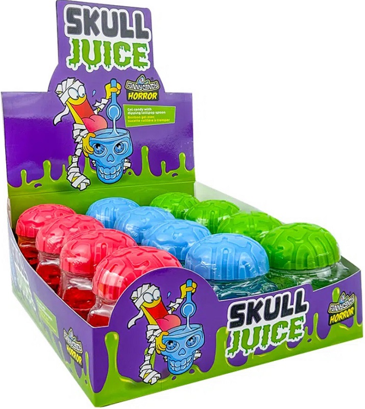 Funny Candy Skull Juice gel Candy mit Lollipop á 90g 3/s (Erdbeere, Blaubeere, Apfel) im 12er T-Dsp.