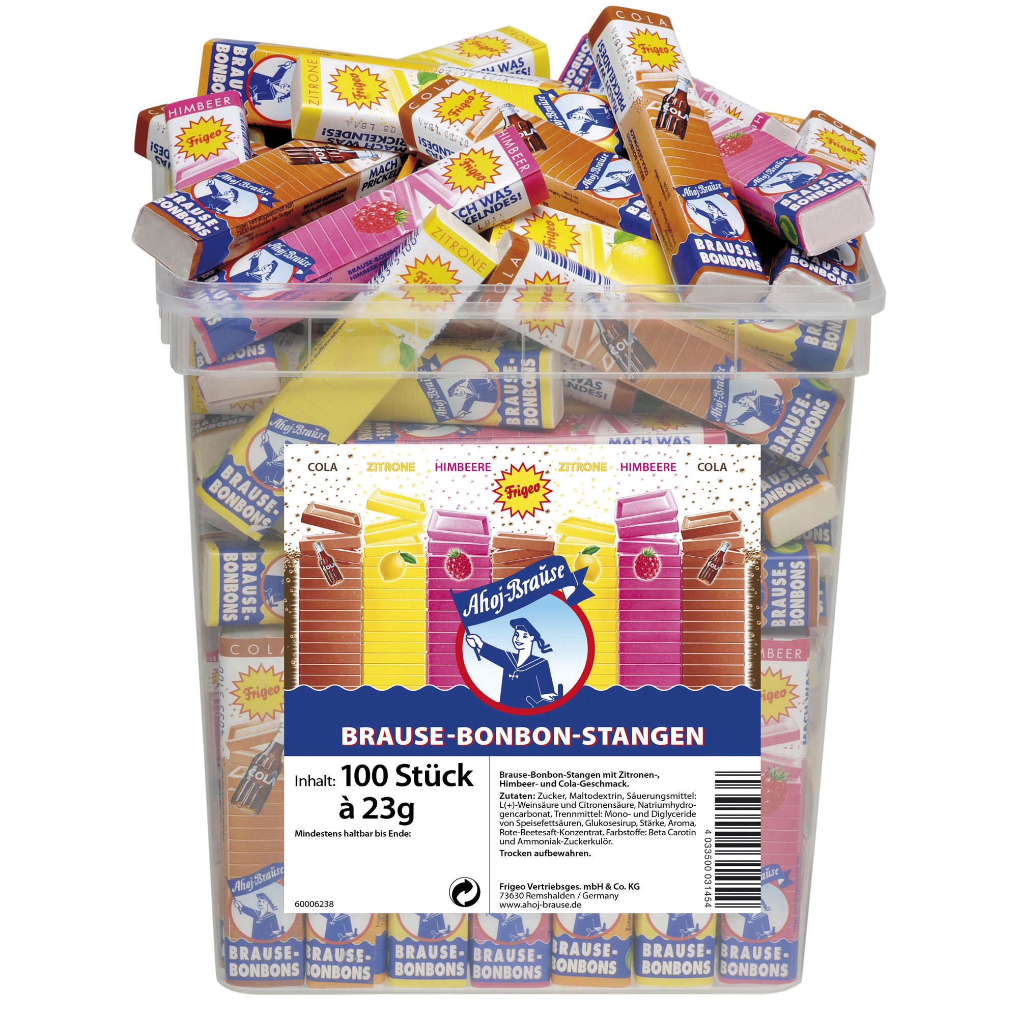 Friegeo Ahoj Brause Bonbon Stangen mit Zitronen Himbeer- und Cola Geschmack 23g in 100er Dose
