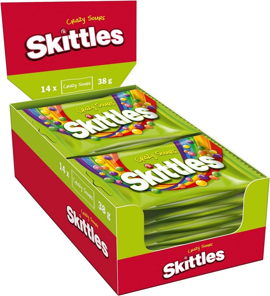 Skittles Crazy Sours Kaudragees in knuspriger Zuckerhülle mit saurem Fruchtgeschmack 38g Beutel im 14er T-Dsp.