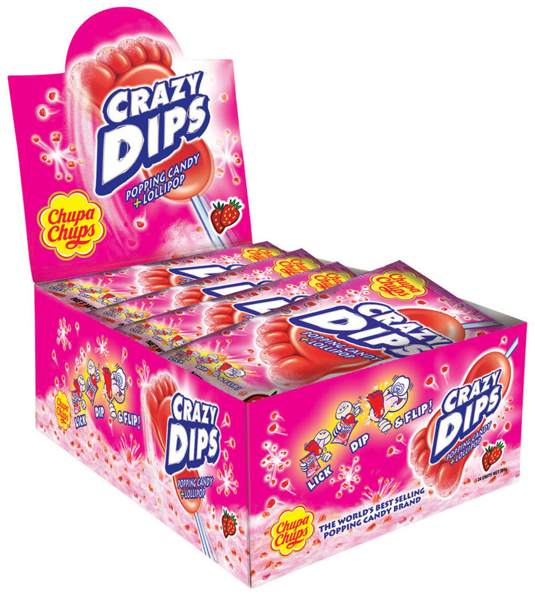 Chupa Chups Crazy Dips Erdbeer geschmack Lolli in Fußform Brausepulver mit Knister-Effekt 14g im 24er Dsp.