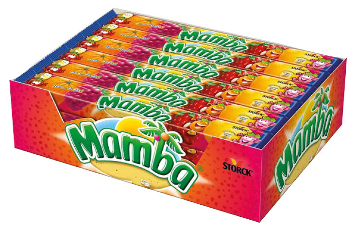 Mamba 4 x 26,5g Original fruchtige Kaubonbons Erdbeere,Himbeere,Orange,Zitrone 106g im 50er T-Dsp.