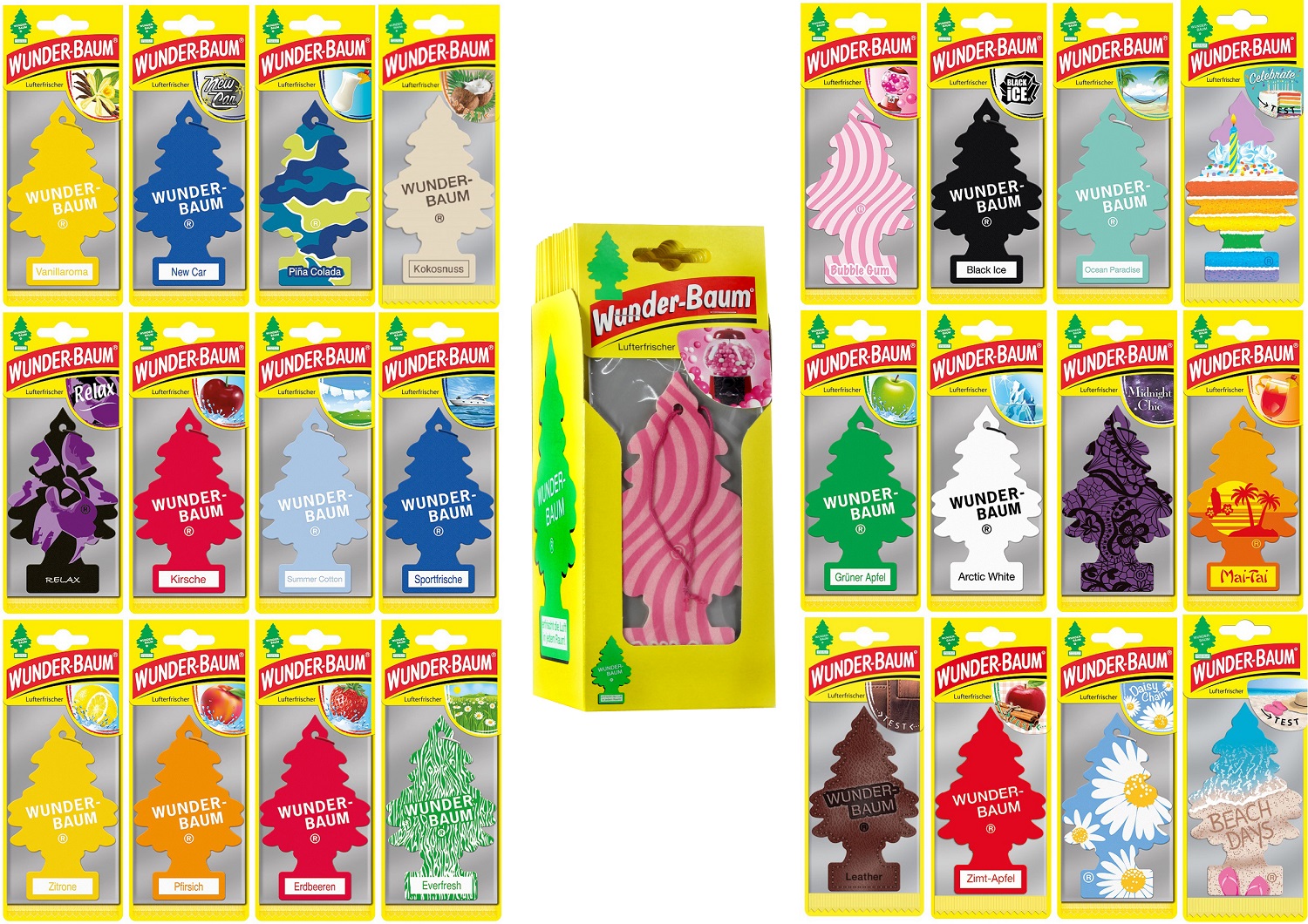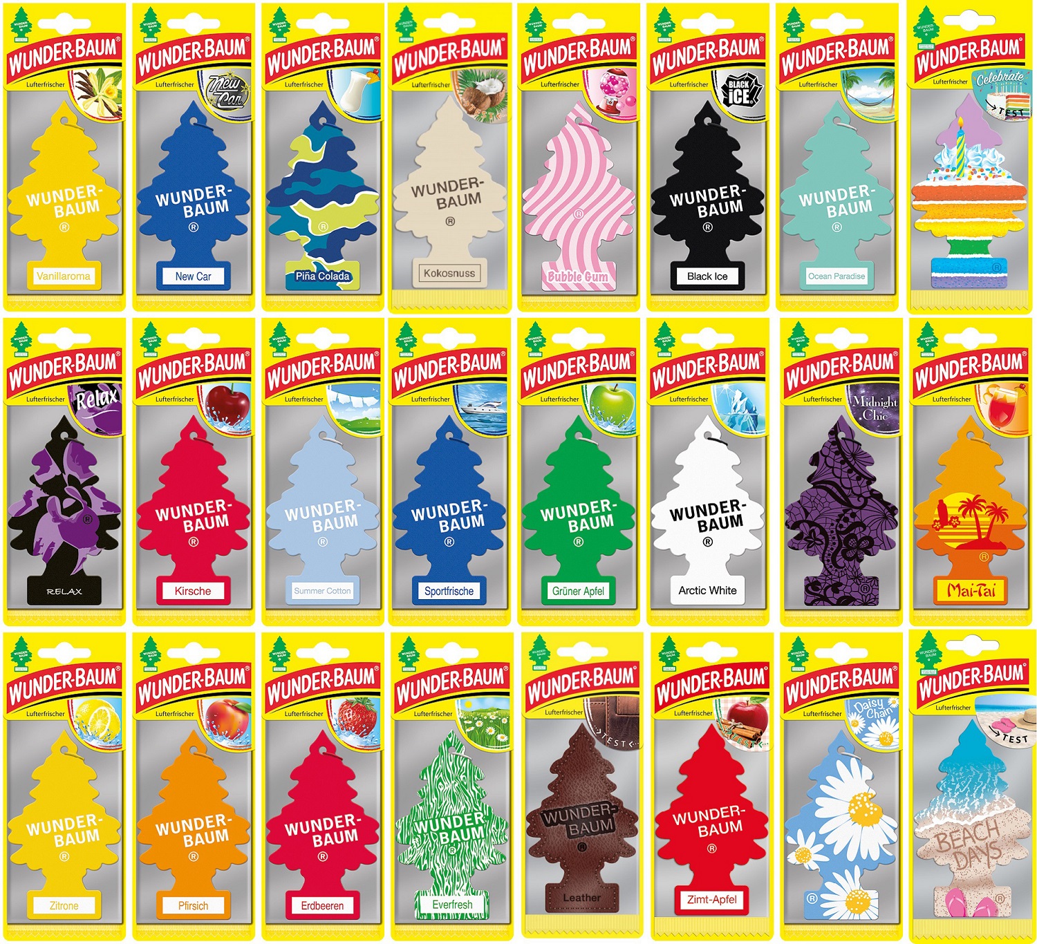 Wunder-Baum MIX 24 Stück-24 Sorten in 24er T-Dsp. (Vanille, New Car, Pina Colada, Kokos, Bubble Gum, Black, Relax, Kirsche, Cotton, Sport, Apfel, Artic, Zitrone, Pfirsich, Erdbeere, Everfresh, Leder, Zimt Apfel, Ocean, Midnight Chic, Daisy Chain, Celebrate, Mai Tai, Beach Days)
