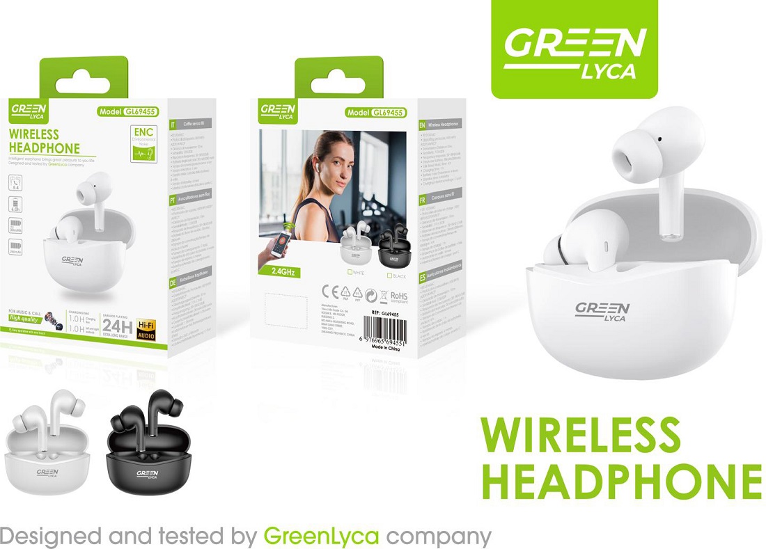 Green Lyca Wireless Bluetooth Kopfhörer In-Ears 2/s mit Ladecase bis zu 24h Akkulaufzeit; 2,4 GHz Bluetooth (Schwarz, Weiß)