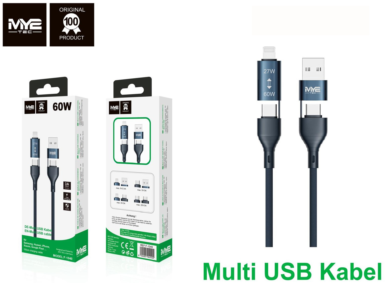 Multi USB- Kabel Fast Charging USB-C / Lightning / USB ca.100cm 60W 3A schwarz(F-1040)