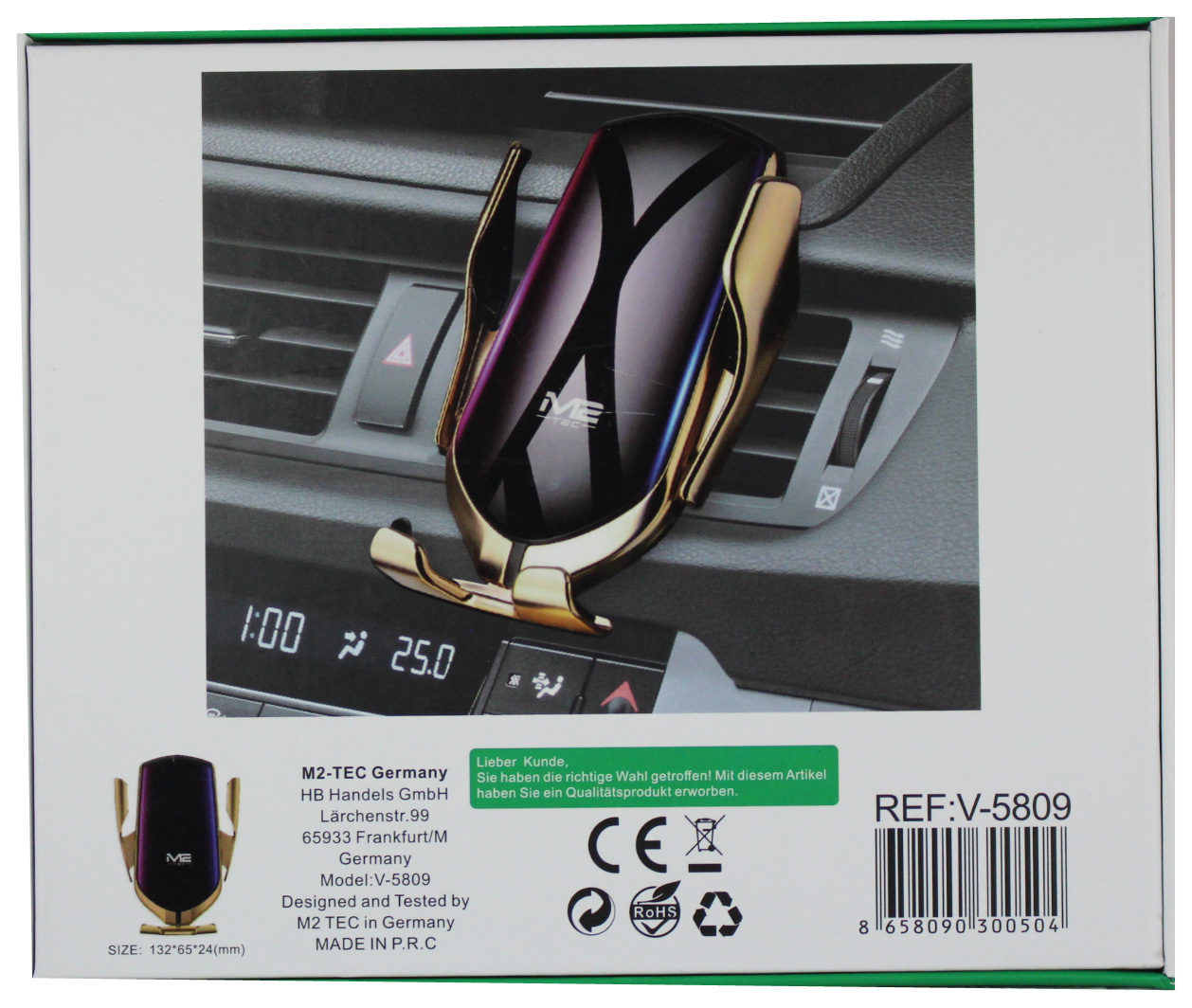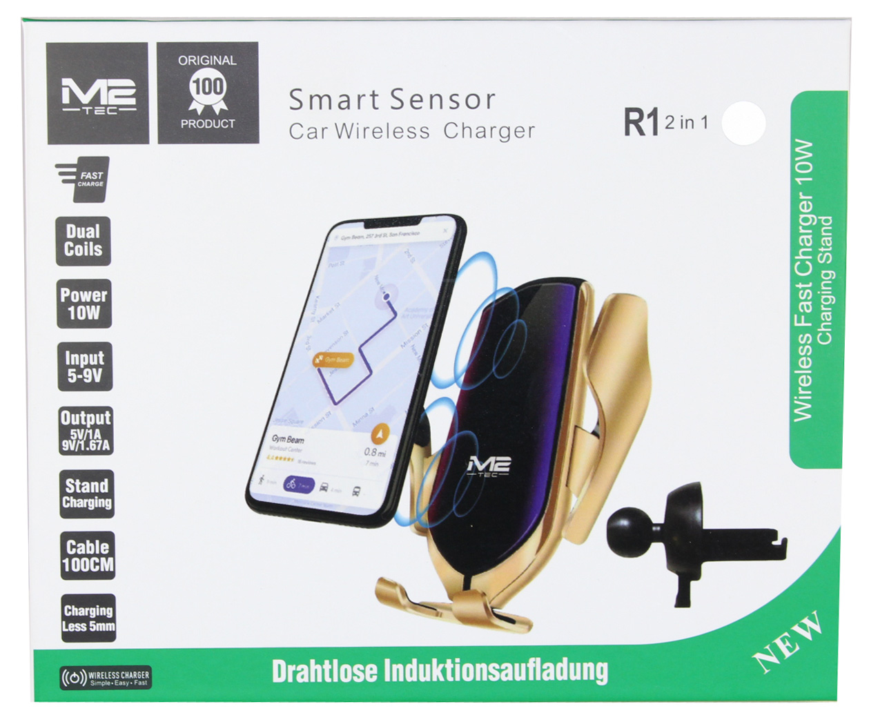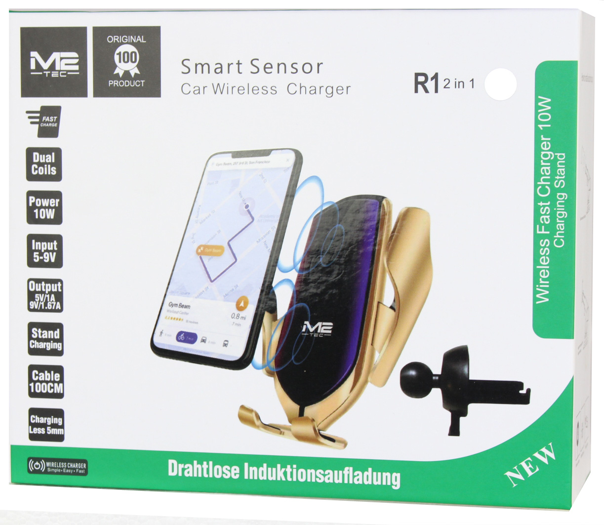 Universal Handy Halterung mir Drahtlose Induktiosaufladung/Wireless Charger SILBER&Gold farben Smart Sensor R1 2 in1 10W input DC5V 2A DC9V 1,67A 1m Kabel 132x65x24mm in Farb Box