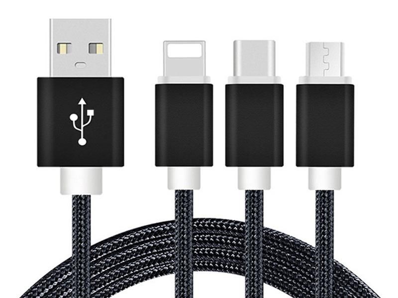 Reekin 3 in 1 Ladekabel (USB Micro, USB Type-C & Lightning) - 1,2 Meter (Schwarz