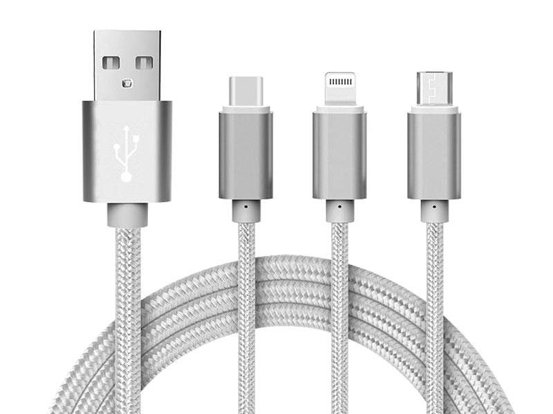 Reekin 3 in 1 Ladekabel (USB Micro, USB Type-C & Lightning) - 1,2 Meter (Silber-Nylon) in Polybag KB