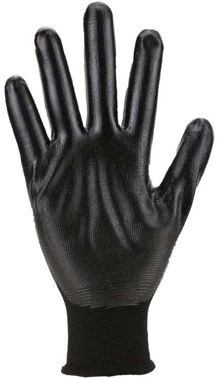 Nitril-Handschuh Polyester Farbe SCHWARZ Handrücken offen EN388:2016 Kat2(3.1.3.