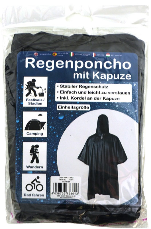 Regenponcho mit Kapuze Schwarz Einheitsgröße inkl. Kordel an der Kapuze, im Polybag